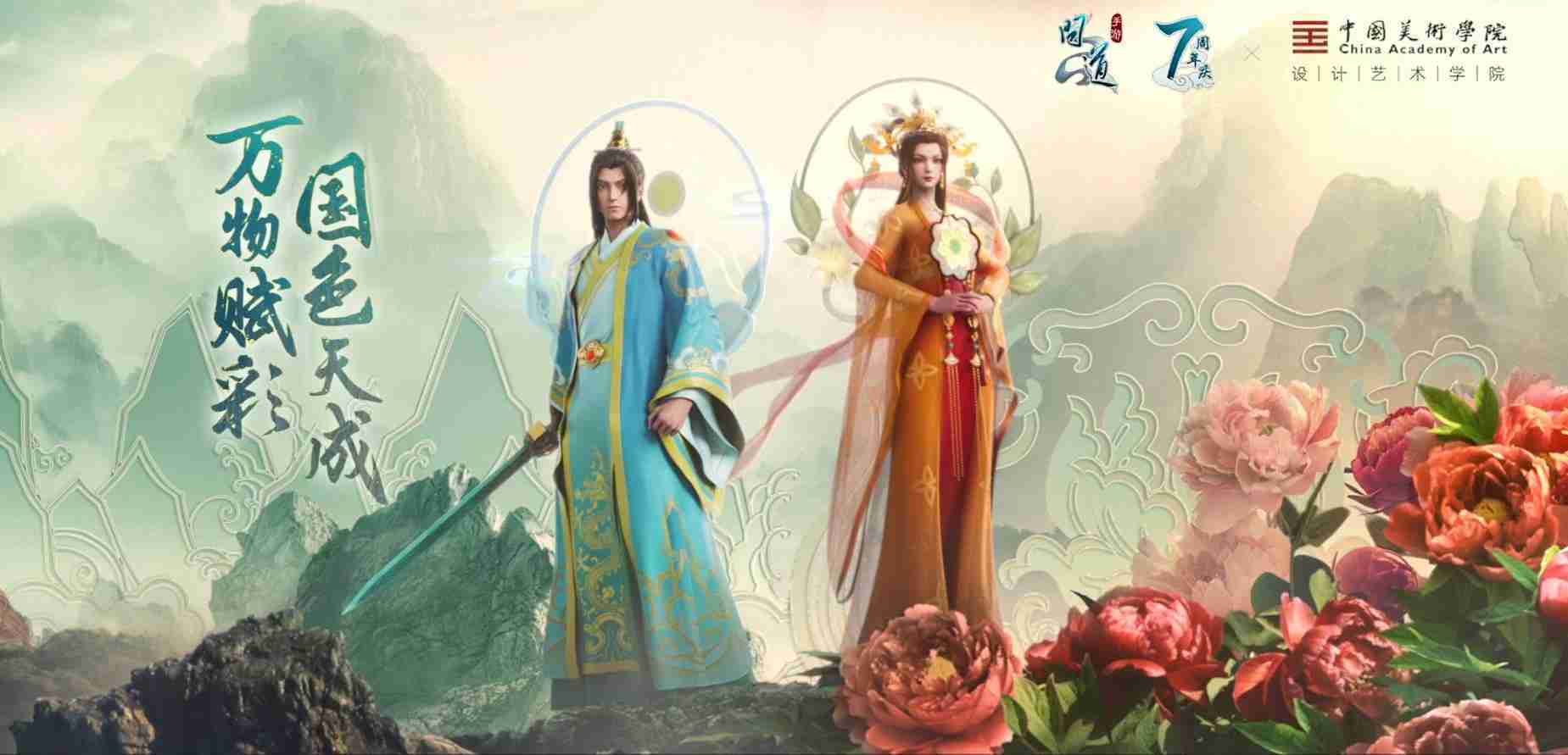 2023年4月,,《问道手游》联动中国美术学院,,,,在游戏中融合了中国历史上不同时期的文化元素,,,,打造了“山河万象”与“凤鸣九霄”的国风时装。。。在色彩配置方面,,创作团队基于对游戏角色特性的分析提取相应的文化内涵,,,从每一种色彩的色相、、、指代事物和情感出发对应角色属性,,,,选定服装的色彩搭配。。。在纹样设计方面,,,创作团队结合游戏角色自身特殊的造型比例和形态,,,,在实际的纹样设计中进行了游戏语境下的活化演绎。。男性角色集中使用了如蟒纹、、、、海水江崖纹、、如意纹和云气纹等传统纹样元素,,女性角色则吸纳了凤凰纹、、、牡丹纹、、卷草缠枝纹等元素,,,组成以“双凤牡丹纹样”“缠枝牡丹纹”“金玉凤冠头饰”为主要纹样的游戏角色装饰图案系统。。