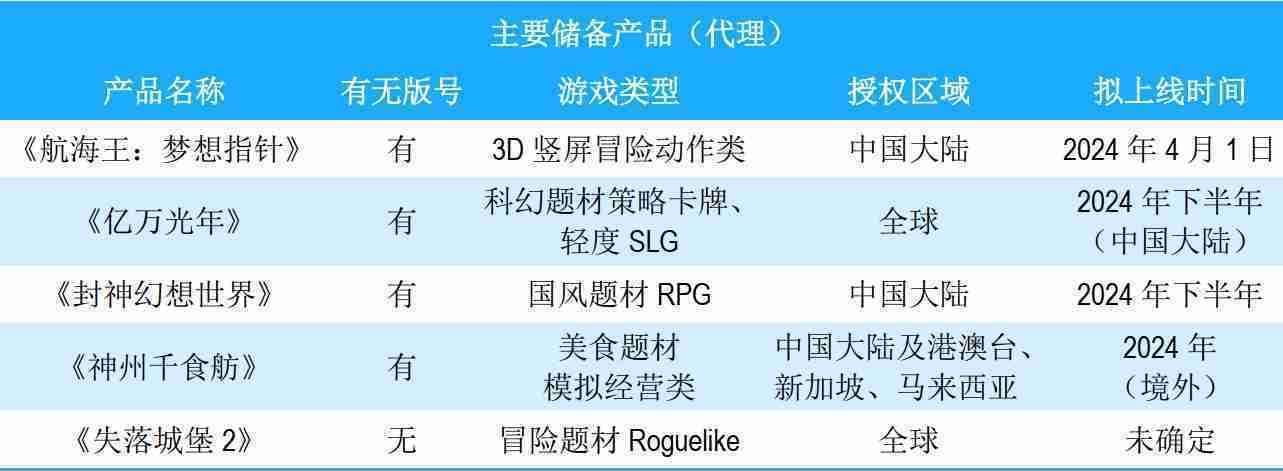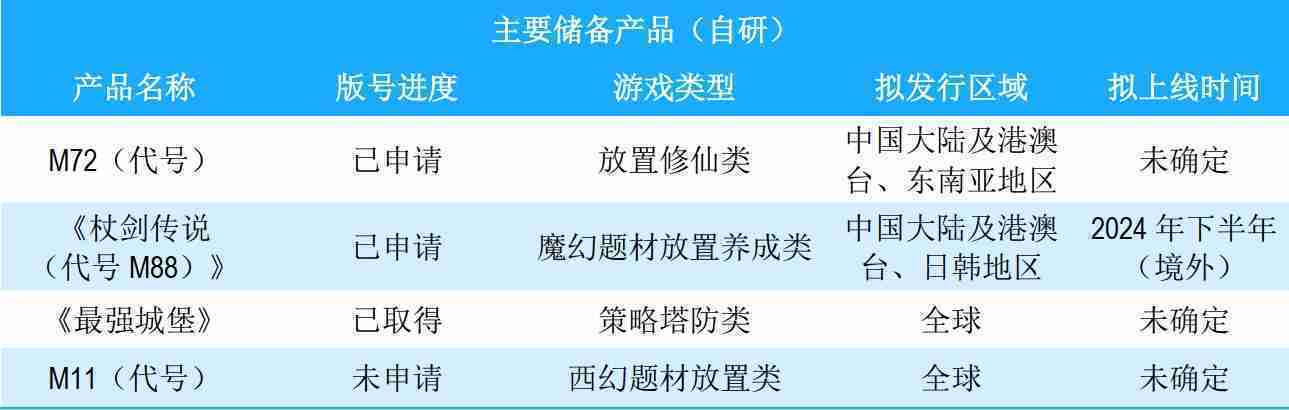 公司储备的多个自研、、、代理产品都在有序推进当中,,涵盖放置类、、、策略类、、、、模拟经营类、、、RPG、、Roguelike等多元化游戏品类,,储备的主要自研和代理产品如下:::