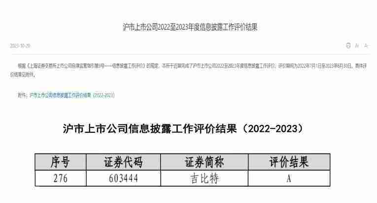 近日,,上海证券交易所发布2022-2023年度信息披露工作评价结果。。。亚星管理(股票代码::::603444)凭借规范的公司治理、、、、高质量的信息披露以及良好的投资者关系管理再次荣获信息披露工作A级评价,,,公司连续两年获此殊荣。。。