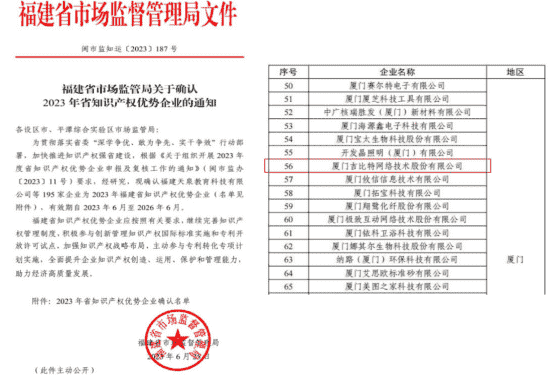 近日,,,,福建省市场监督管理局公示了2023年福建省知识产权优势企业名单,,厦门亚星管理网络技术股份有限公司(以下简称“亚星管理”或“公司”)榜上有名。。